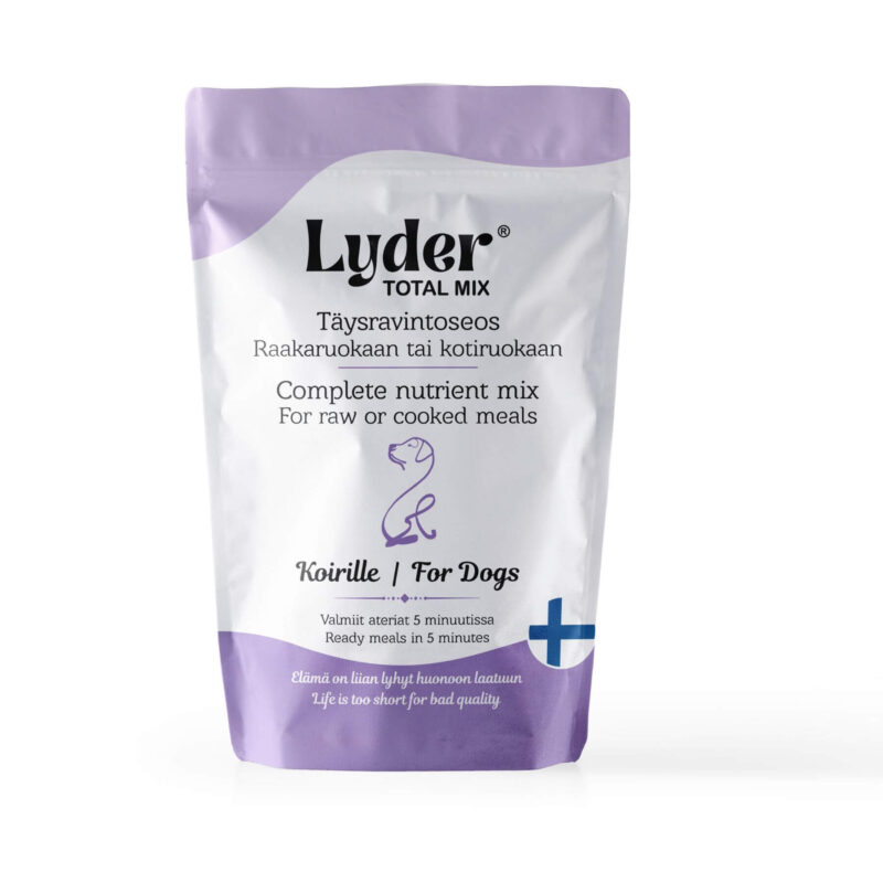 Lyder Total Mix on valmis täysravintoseos lisättäväksi koiran raakaruokaan tai kotiruokaan. Voit unohtaa erilaiset vitamiinit, mineraalit, öljyt, kuidut ja nivelaineet, sillä Lyder Total Mix sisältää ne kaikki ja juuri oikeassa suhteessa. Valmista koiranruokaa viidessä minuutissa!
